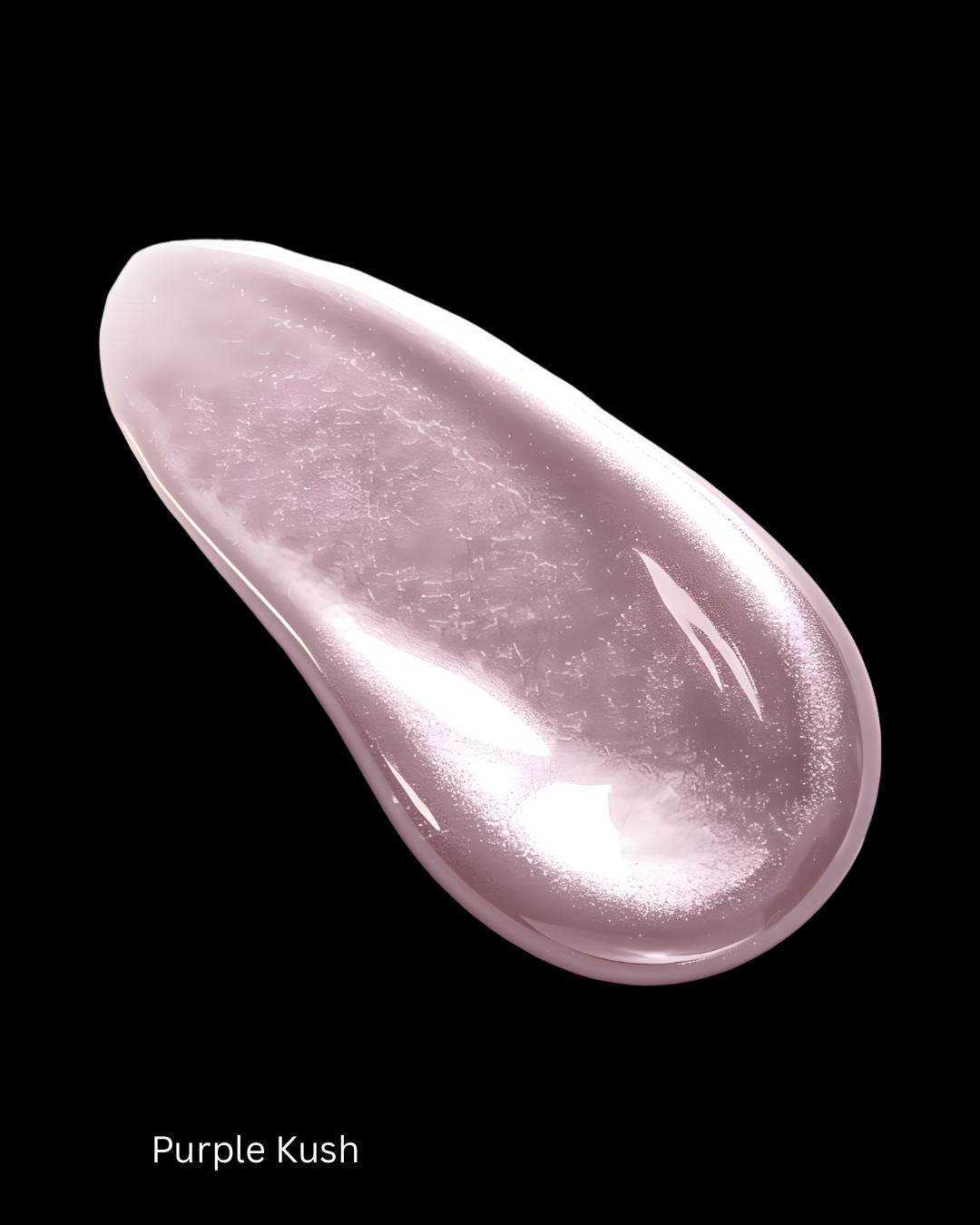Purple Kush is a Lilac Purple, Clear Based Gloss; infused with iridescent and multi-colored weed leaf glitters. Infused Natural Hemp Oils.
